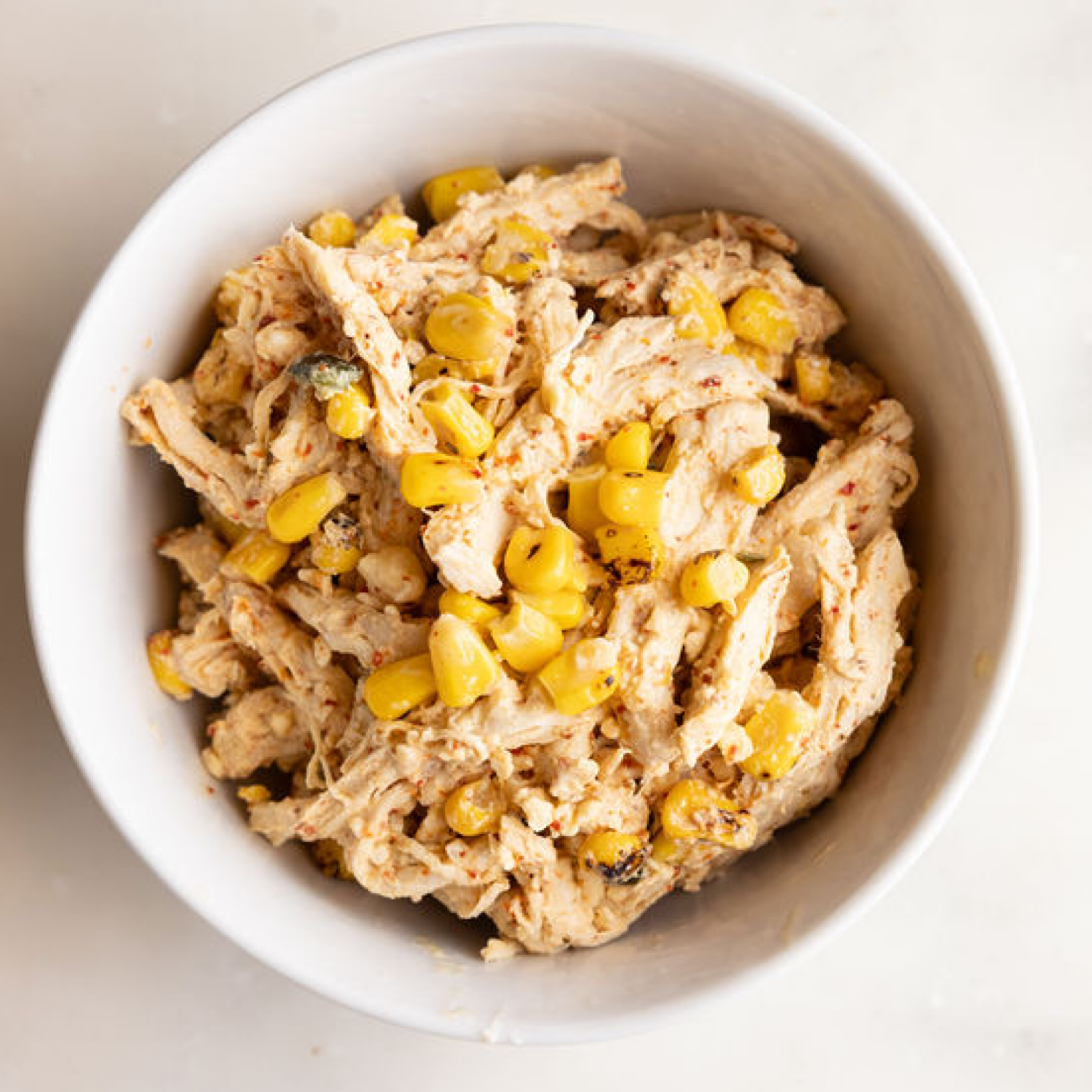 Inspired by Elote (Mexican Street Corn), this chicken salad has mayo, sour cream, chili lime seasoning, corn, and cotija cheese.